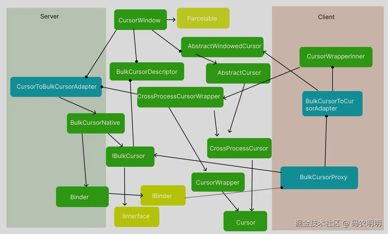 这个代码比较简单,把需要查询的条件写入到Parcel中,然后通过mRemote进行binder调用,在reply中拿到远端执行的结果。如果执行成功了,则通过BulkCursorDescriptor来读取reply中的数据,主要是拿到了其中IBulkCursor的Binder对象和CursorWindow这个对象。在查询的流程中会涉及到很多的类,我这里画了使用端和服务端会使用到的Cursor所涉及到相关类和接口。
