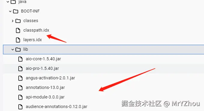 这个springboot的可识别一个参数,这么配后,就不会走正常的启动逻辑,而是运行一个jar分层逻辑,把jar包中内容打整理为多个部分。生成一个索引文件laryers.idx,引用了外部库的。和业务代码隔离