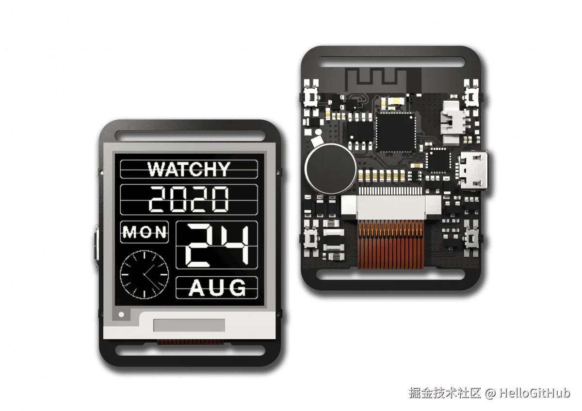 39、Watchy:开源电子墨水屏智能手表。该项目是采用 ESP32-PICO-D4 和电子墨水屏制作的一款智能手表,支持日历、闹钟、步数、手势检测,以及 WiFi 和蓝牙等功能。