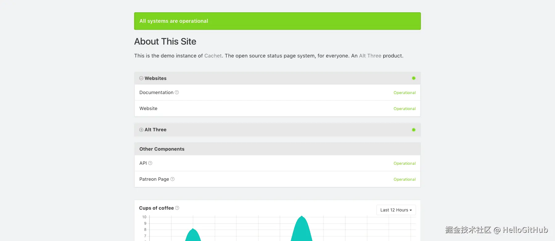 22、cachet:PHP 写的服务运行状态页面。该项目是采用 Laravel+Bootstrap 构建的服务状态监控和管理平台,免费且开源。它不仅可以自动监控服务的正常运行时间,还提供了管理后台支持主动记录和维护事故信息,支持多语言、自托管、移动端适配和邮件通知等功能。