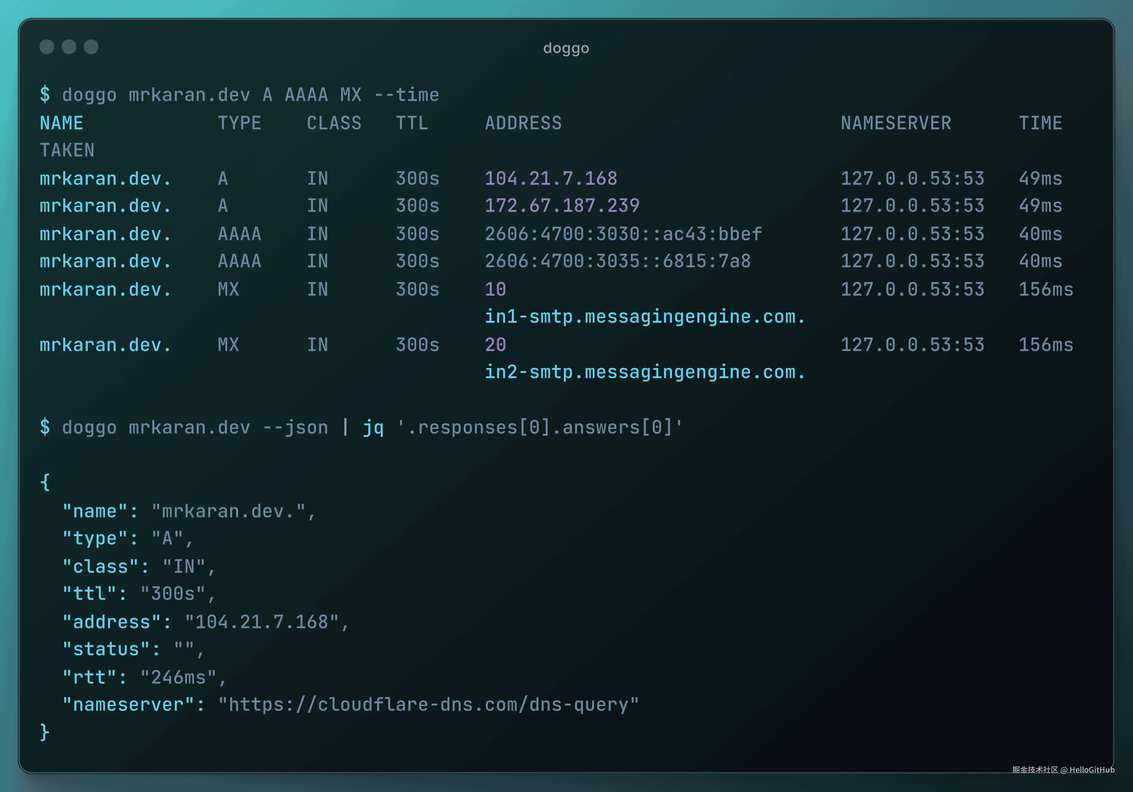 8、doggo:友好的命令行 DNS 查询工具。该项目是用 Go 语言编写的命令行 DNS 客户端工具,安装简单且开箱即用。它提供了友好的命令行界面,可快速显示 DNS 记录信息,支持高亮显示、响应时间和多种 DNS 记录类型等,适用于网络诊断等场景。