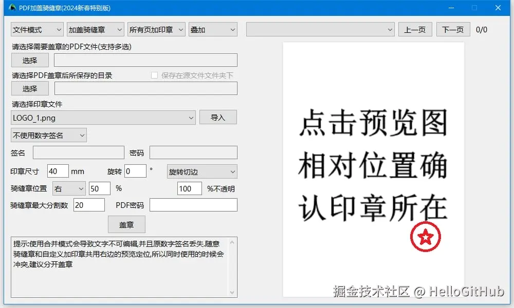 5、PDFQFZ:免费的 PDF 加盖骑缝章工具。该项目是用于在 PDF 文件上加盖骑缝章的工具,适用于 Windows 平台。它不仅免费且开源,使用时可以指定目录,对多个 PDF 文件进行批量处理,并支持预览、调整印章大小和位置等功能。