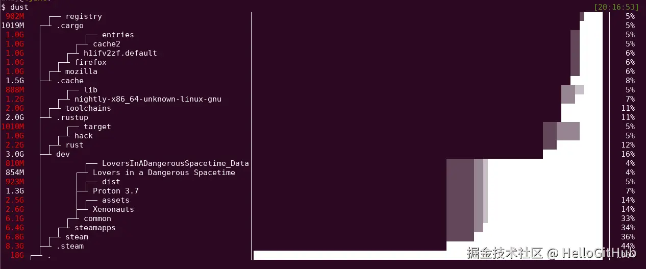 31、dust:快速显示硬盘使用情况的命令行工具。这是一个可视化磁盘使用情况的命令行工具,名字源自 du 和 Rust 编程语言组合。它体积小巧、运行速度快,能够以直观的方式展示磁盘空间概览。来自 @DeShuiYu 的分享
