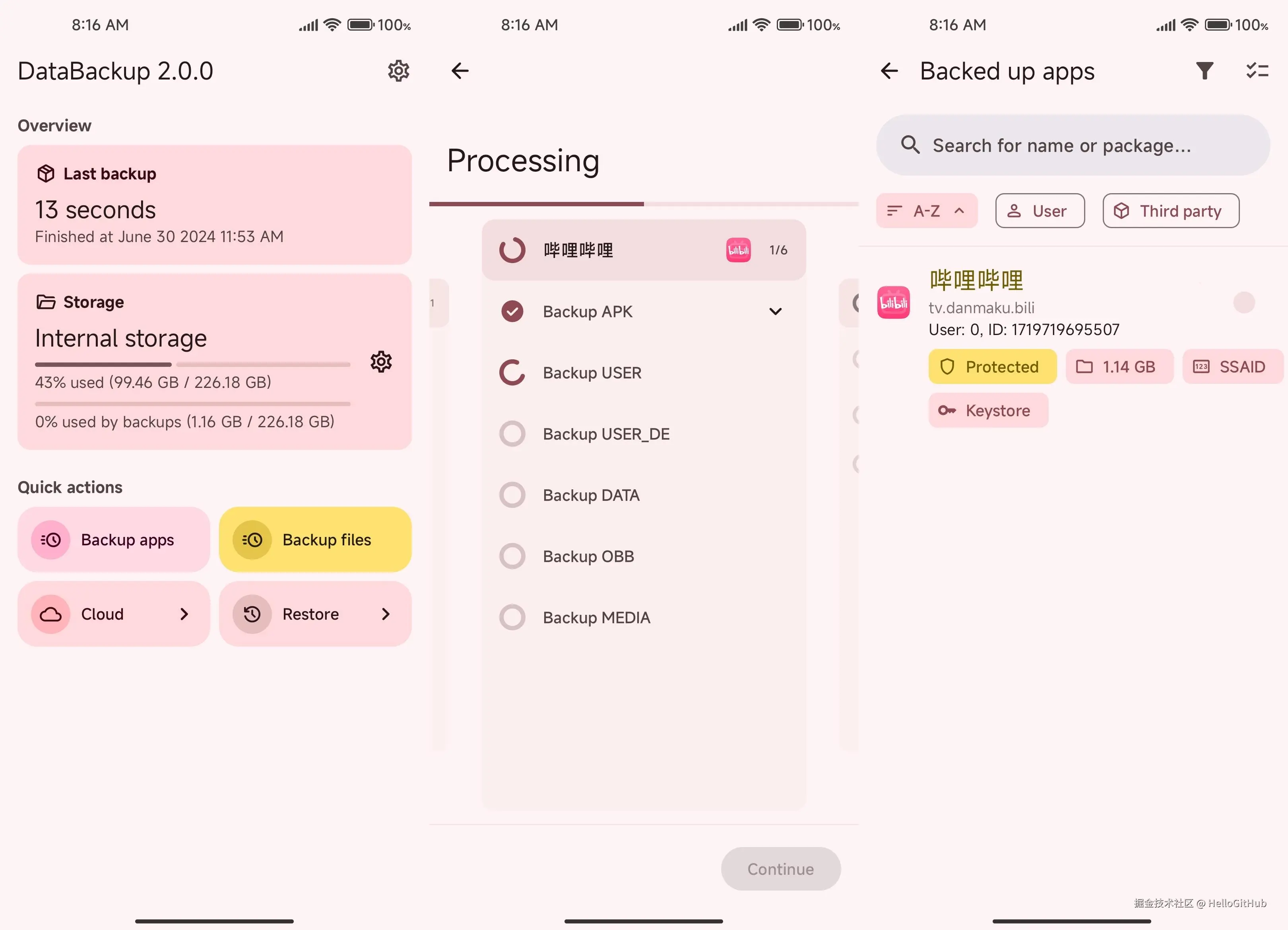 20、Android-DataBackup:Android 的数据备份应用。该项目为 Android 7.0 及以上系统,提供了应用数据的备份和恢复功能,解决了换机后应用需要重新登录或下载额外数据包等问题。
