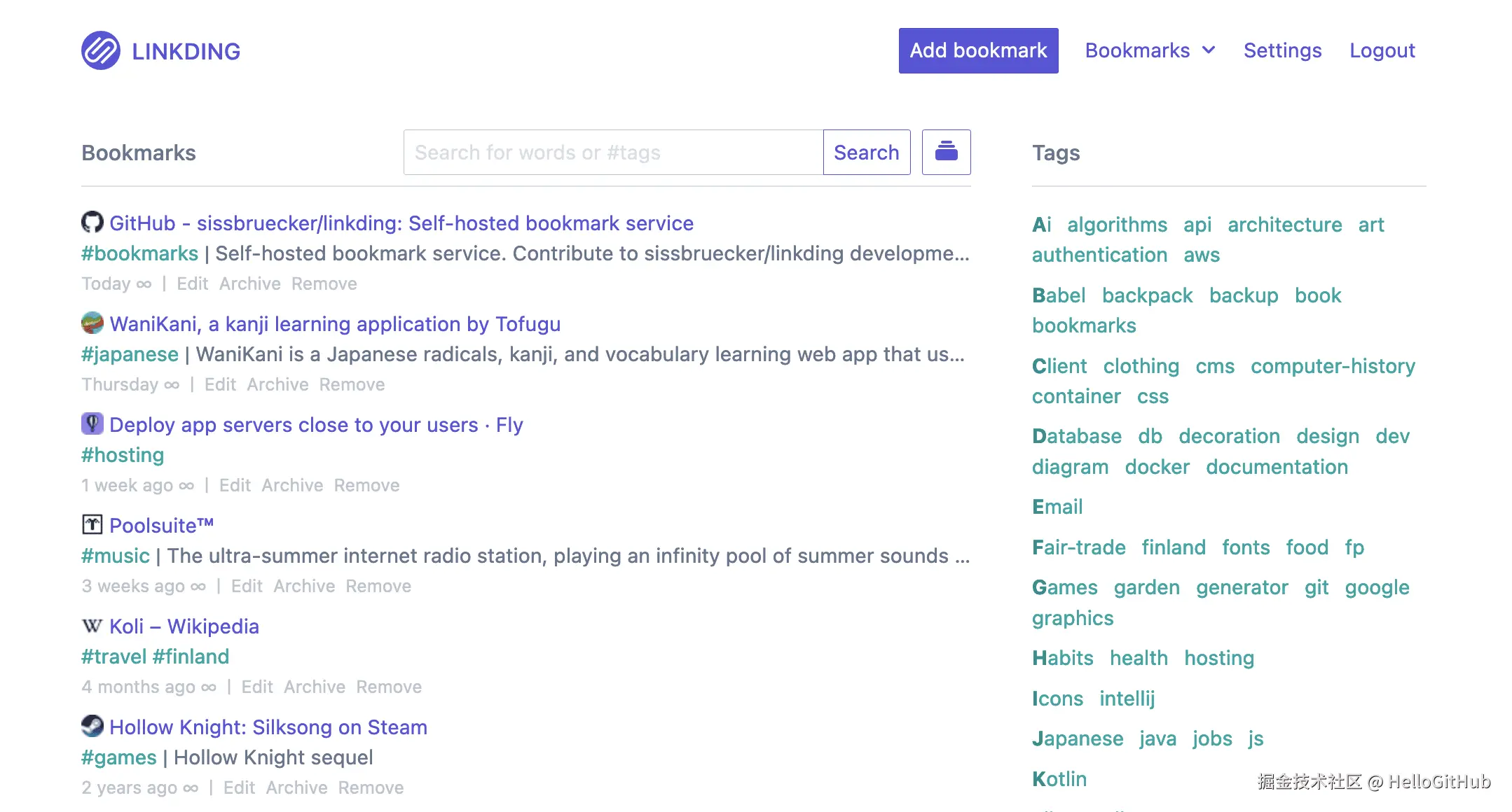 26、linkding:极简的浏览器书签管理平台。该项目是基于 Django 构建的浏览器书签管理平台,它提供了简洁易用的 Web 界面和强大的搜索功能,支持标签分类、批量编辑和稍后阅读等功能,并配有 Chrome 和 Firefox 插件,方便用户随时随地保存和访问书签。