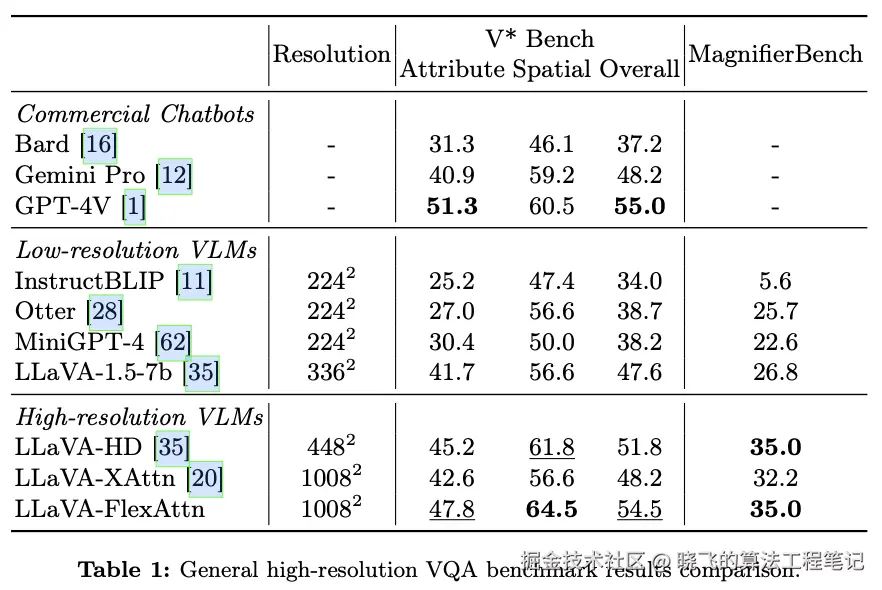 在几个高分辨率多模态基准测试上评估了 ,包括一般基准测试如V* Bench和Magnifierbench,以及领域特定的基准测试如TextVQA(文本理解)和RSVQA(遥感)。实验结果展示了与其他高分辨率方法相比表现更好,并且几乎减少了40%的计算成本。此外,在V* Bench上, 相比于商业聊天机器人如GPT-4V,获得了更高的分数。