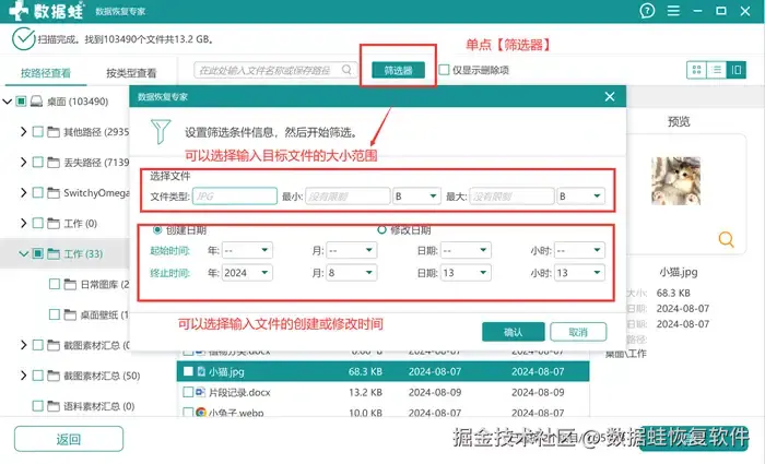 步骤2: 扫描结束后,用户可以选择直接【全部导出】或者选择需要恢复的部分文件进行恢复。推荐使用【筛选器】功能,能够根据自己误删文件的时间去进行文件搜素范围的缩小,十分方便。