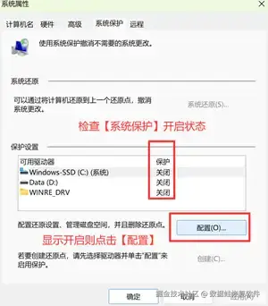 步骤3: 检查是否开启“系统保护”【系统保护】,如开启,点击【配置】进入下一步操作,设置电脑还原点。