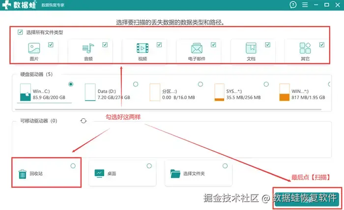 步骤1: 安装好软件后打开,在软件的首页勾选好目标恢复的文件类型和回收站,然后使用鼠标点击【扫描】。
