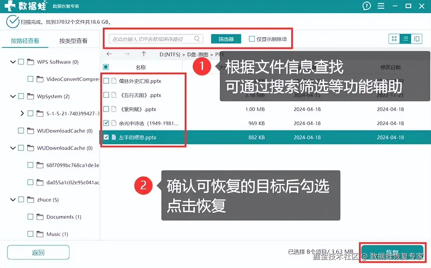 第三步:扫描完成后,用户可以在页面中借助各项功能快速定位至目标文件。勾选它们点击 【恢复】 ,最后,选择一个合适的恢复路径即可。