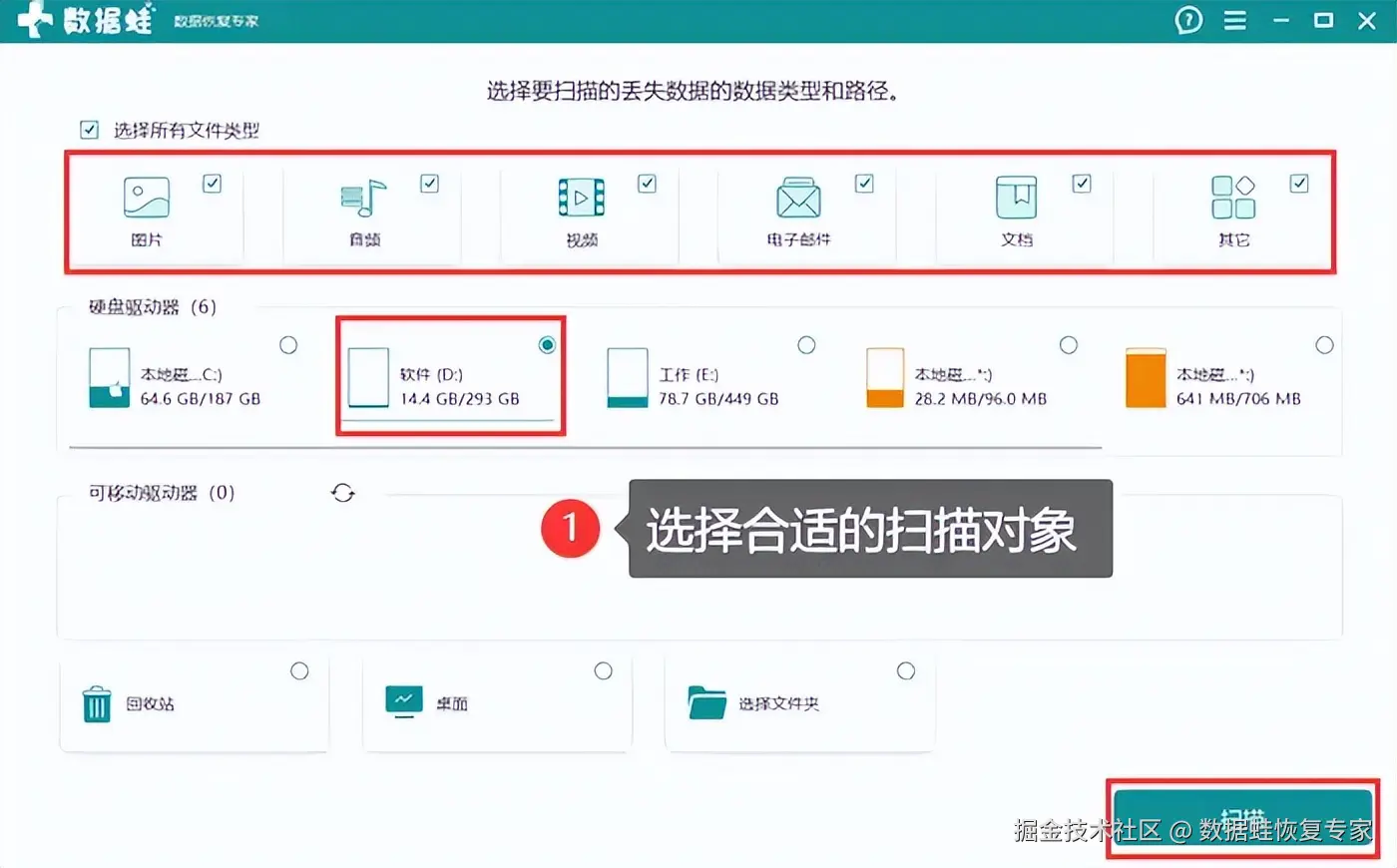 第二步:安装完成后,用户可立即运行软件。在页面中根据提示,选择丢失数据的文件类型和路径,点击右下角的绿色按钮,进行扫描并等待。