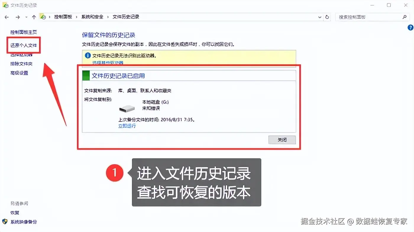 文件历史记录是Windows系统中的一项功能,它可以自动备份你的文件到另一个驱动器上,以便在需要时进行恢复。如果在文件删除之前,你启用了该功能,那么现在就可以进入控制面板,查看你的历史记录,并将删除的数据立刻找回!