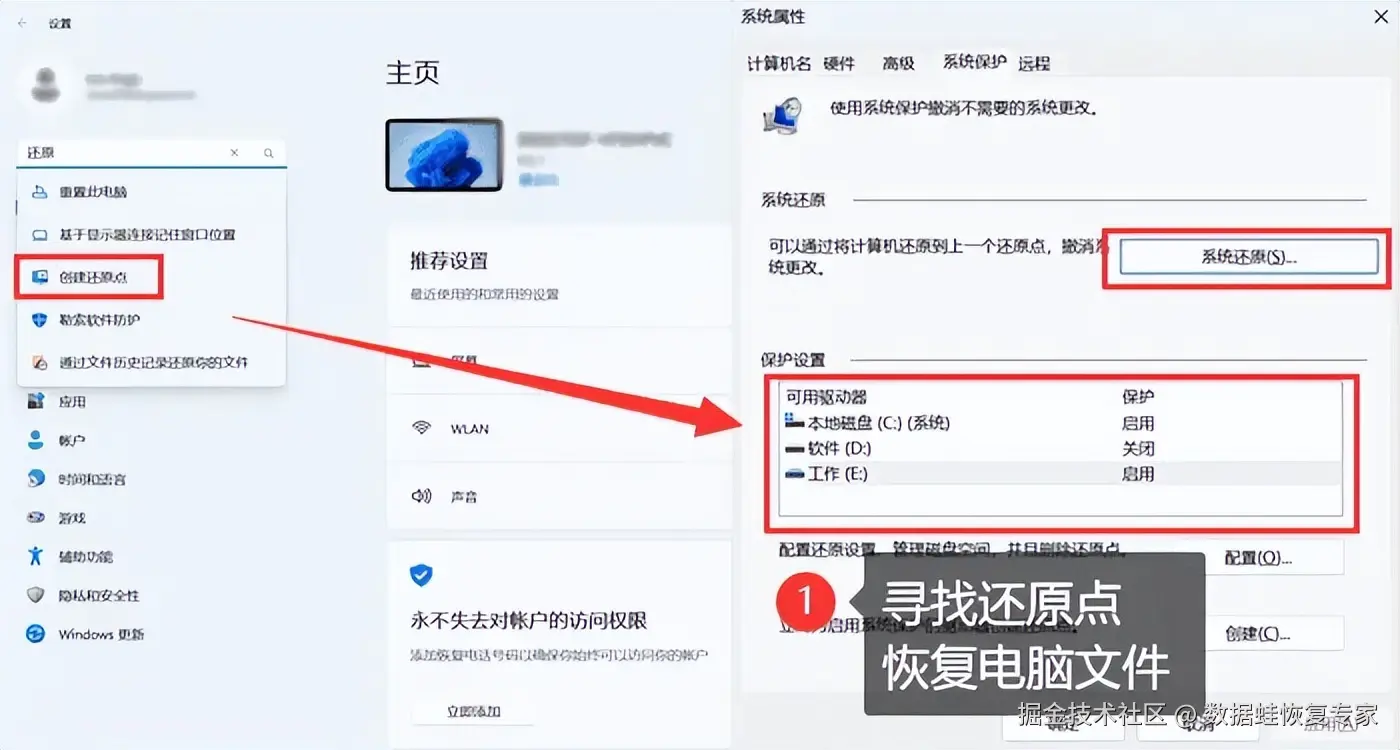 除了文件历史记录,你还可以查看电脑的系统还原点。这是一种将电脑当前状态保存为一个还原点的功能,当我们遇到问题或误删除文件时,可以通过还原到这个点来恢复电脑的原始状态,达到恢复电脑文件的目的。不过,你需要确保自己已经创建了还原点,具体可以进入设置查看。