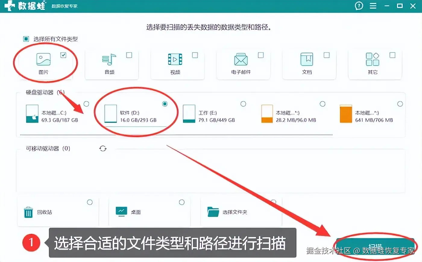 步骤2:运行并扫描数据。根据提示选择恢复对象,即你所想要扫描的文件数据类型和路径。