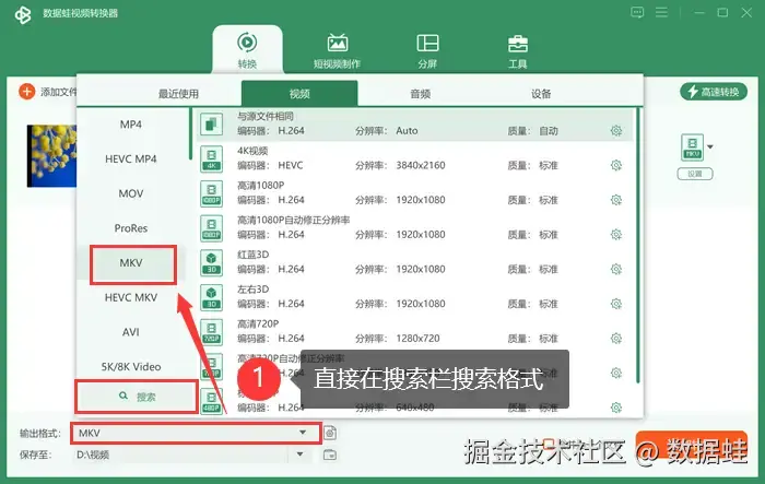 第二步: 在软件界面的左下角点击 【输出格式】 按钮,在弹出的格式选项列表中,寻找并选定 【mkv】 作为输出格式。我们也可以在搜索栏直接搜索目标格式,减少寻找时间。