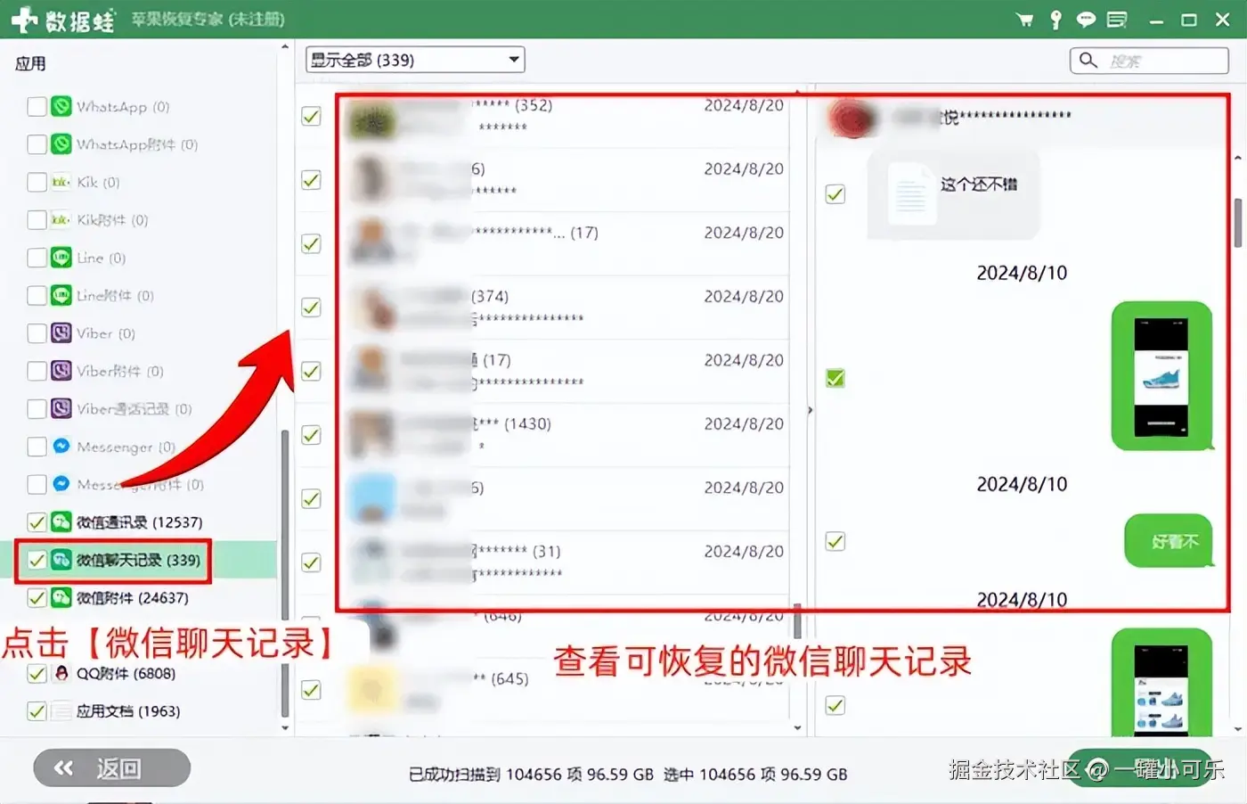 步骤2:扫描完成后,点击 【微信聊天记录】 ,即可在屏幕上显示可以恢复的微信聊天记录,滑动鼠标滚轮查看这些数据是否正确。