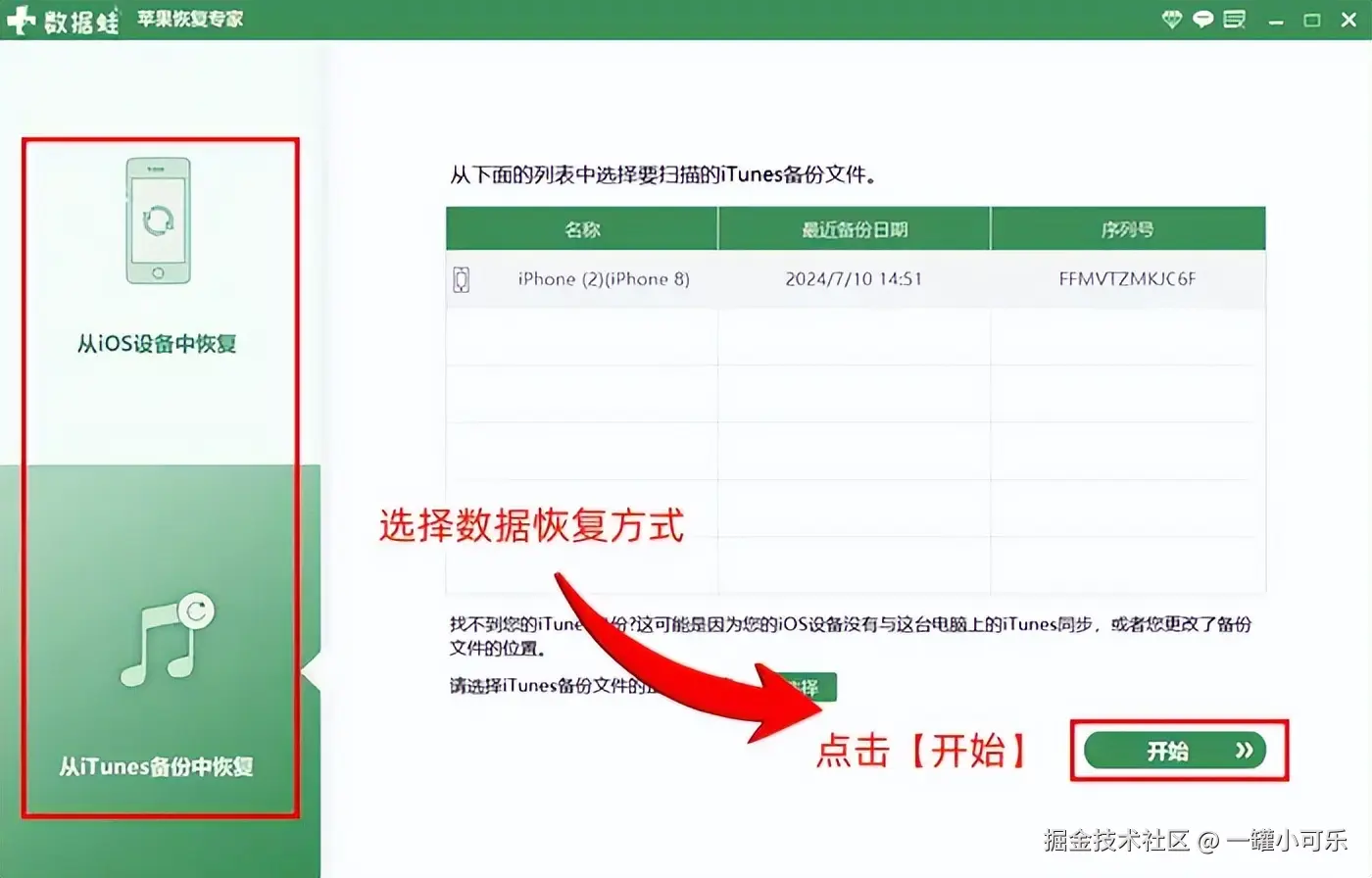 步骤1:下载软件至电脑上,运行后,选择适合的数据扫描方法,如 【从iOS设置中恢复】或【从iTunes备份中恢复】 ,然后点击 【开始扫描】 。