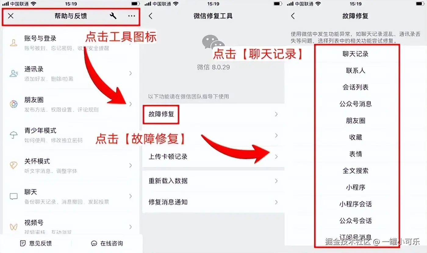 步骤3:在【故障修复】界面弹出来的选项上,选择 【聊天记录】 ,然后静待数据修复成功即可。