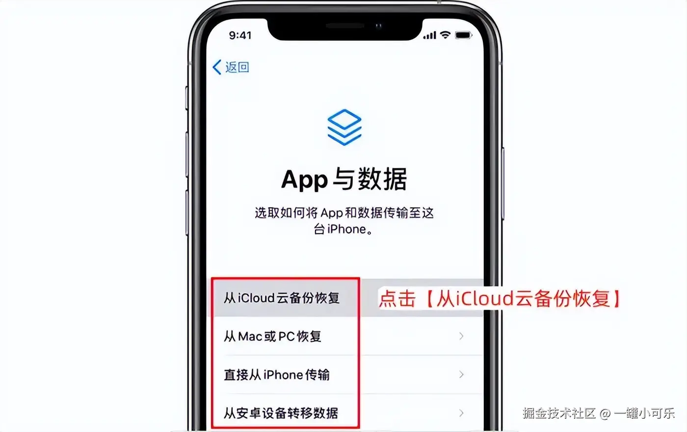 步骤2:重启手机,根据屏幕提示,选择 【从iCloud云备份】 中恢复的方式,等待数据恢复至手机上即可。