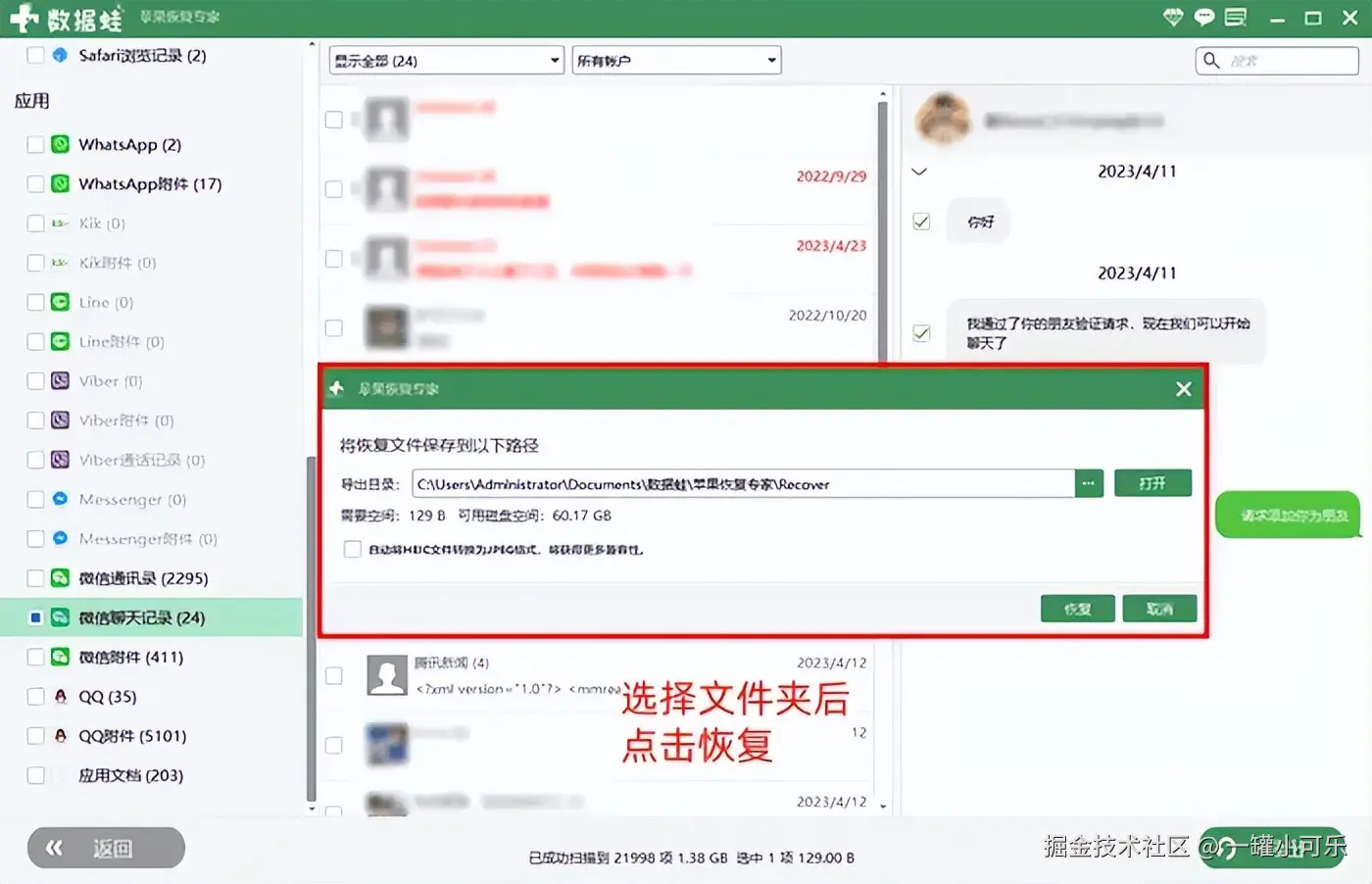 步骤3:在工具弹出的提示上,选择导出数据的存储位置,点击 【恢复】 ,等待数据导出成功后,即可在对应的文件夹中找到删除的微信聊天记录。