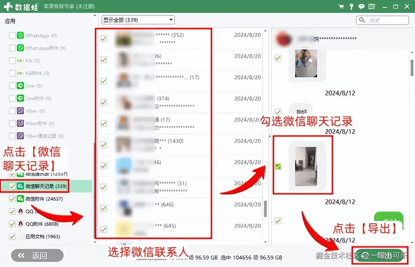 步骤2:点击应用栏下的 【微信聊天记录】 ,查找删除的微信聊天记录,确认后勾选,点击 【导出】 按钮。
