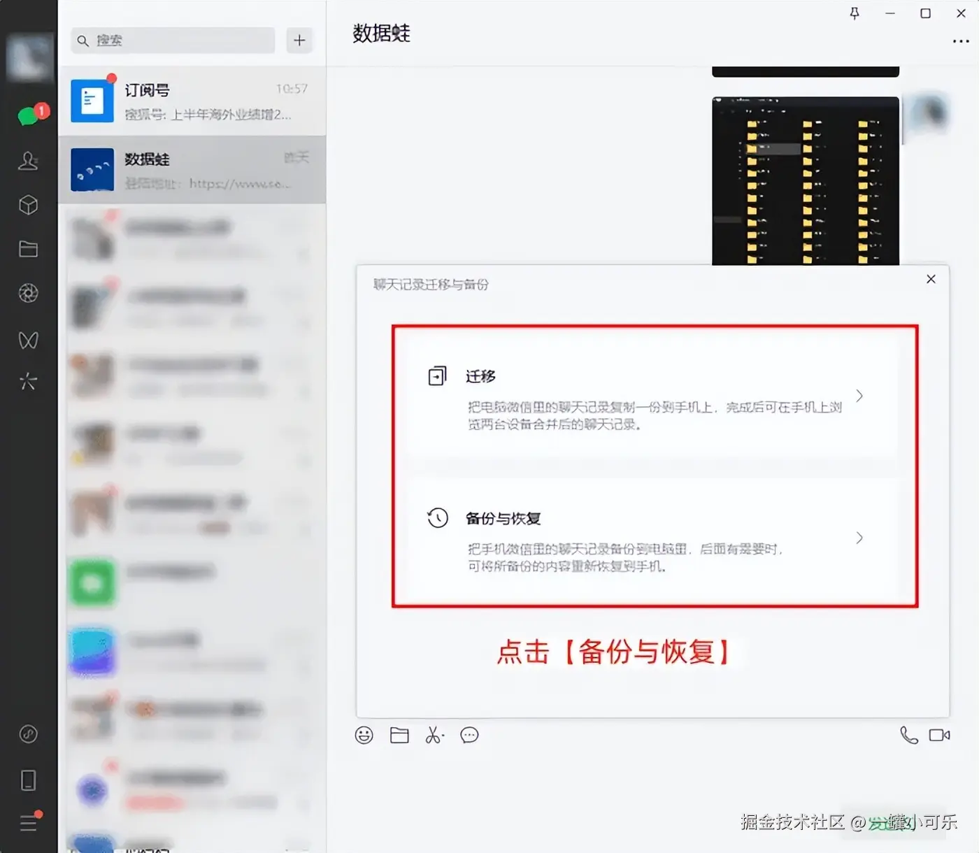 步骤1:打开微信点击 【迁移与备份】-【备份与恢复】 。