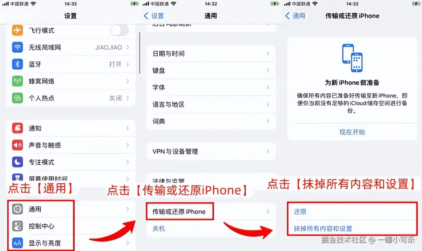 步骤1:在手机设置里,依次点击 【通用】-【传输与还原iPhone】-【抹掉所有内容和设置】 。