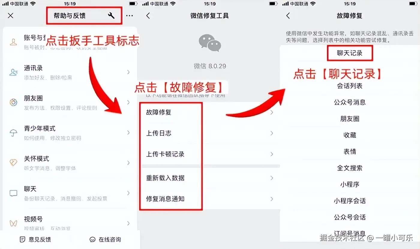 步骤2:根据微信的界面提示,依次点击 【故障修复】-【聊天记录】 即可恢复删除的聊天记录。