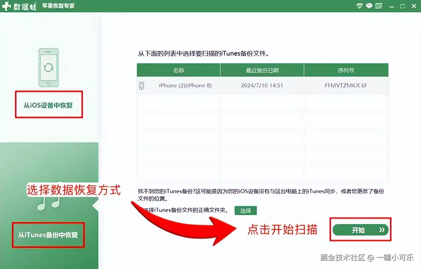 步骤1:将这个工具安装到电脑合适的磁盘上,并用数据线连接iPhone和电脑,选择合适的数据扫描方式,然后点击 【开始扫描】 。