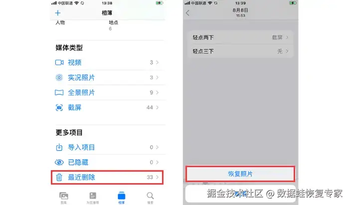手机照片恢复方法1:使用【最近删除】功能