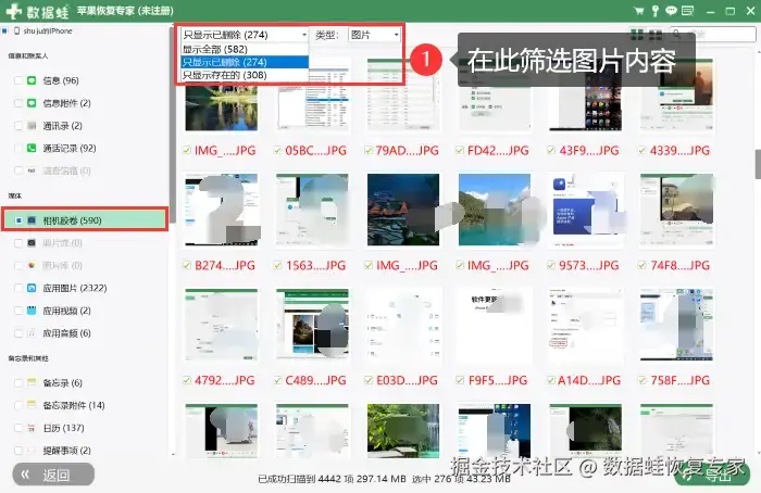 步骤3:等待扫描完成,然后勾选 【相机胶卷】 查看手机照片并筛选您想要恢复的照片,然后点击 【恢复】并【导出】 到手机上就可以了。