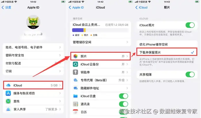 如果您开启了iCloud照片库或定期备份手机数据到iCloud,那么从iCloud备份中恢复照片就是一个简单有效的方法。操作方法是:登录上您的Apple ID,开启iCloud照片库,点击 【下载并保留原片】 即可将过期的照片恢复到设备中。