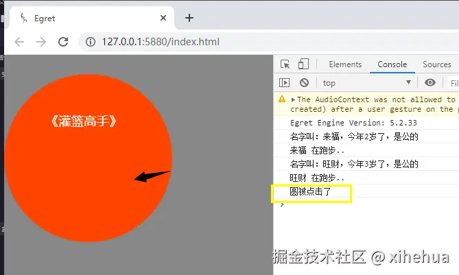 }(createGameScene()这个方法下写) //给circle绑定点击侦听事件 //注意要打开circle可以点击 因为来默认是不允许点击的 所以要手动打开 circle.touchEnabled = true; //可以记录一下被点了多少次 var num: number = 0; circle.addEventListener(egret.TouchEvent.TOUCH_TAP,function(){ console.log('我被点击了'); },this);