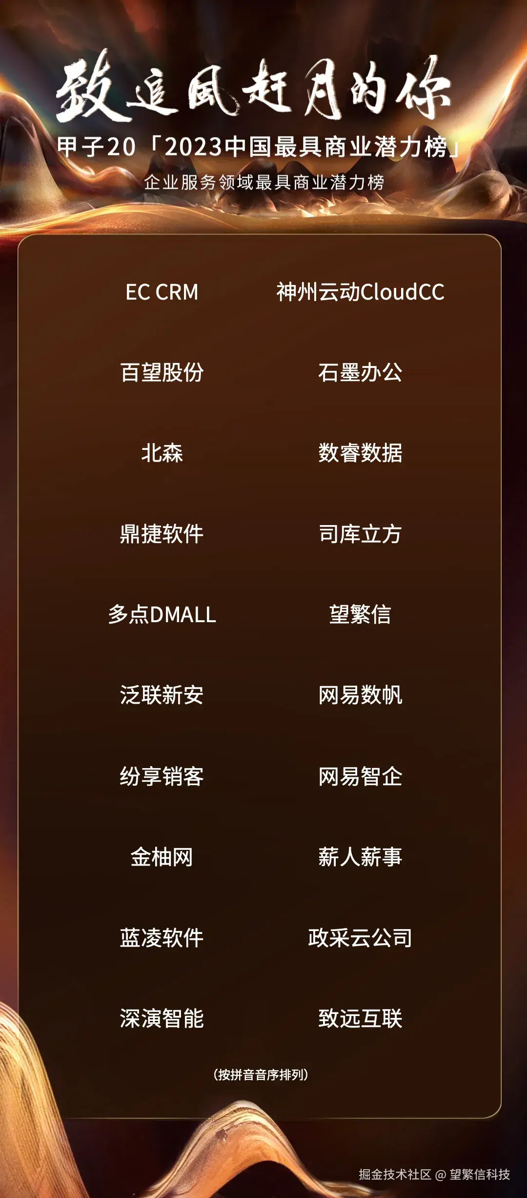 **此次入选“甲子20—2023中国企业服务领域最具商业潜力榜”,是行业内外对望繁信科技降本、增效、提质、控险实力的高度认可。**未来,望繁信科技将再接再厉,砥砺前行,继续深挖流程挖掘前沿应用中蕴藏的宝矿,让更多优秀的同行者、践行者受益于数字技术带来的巨大红利!