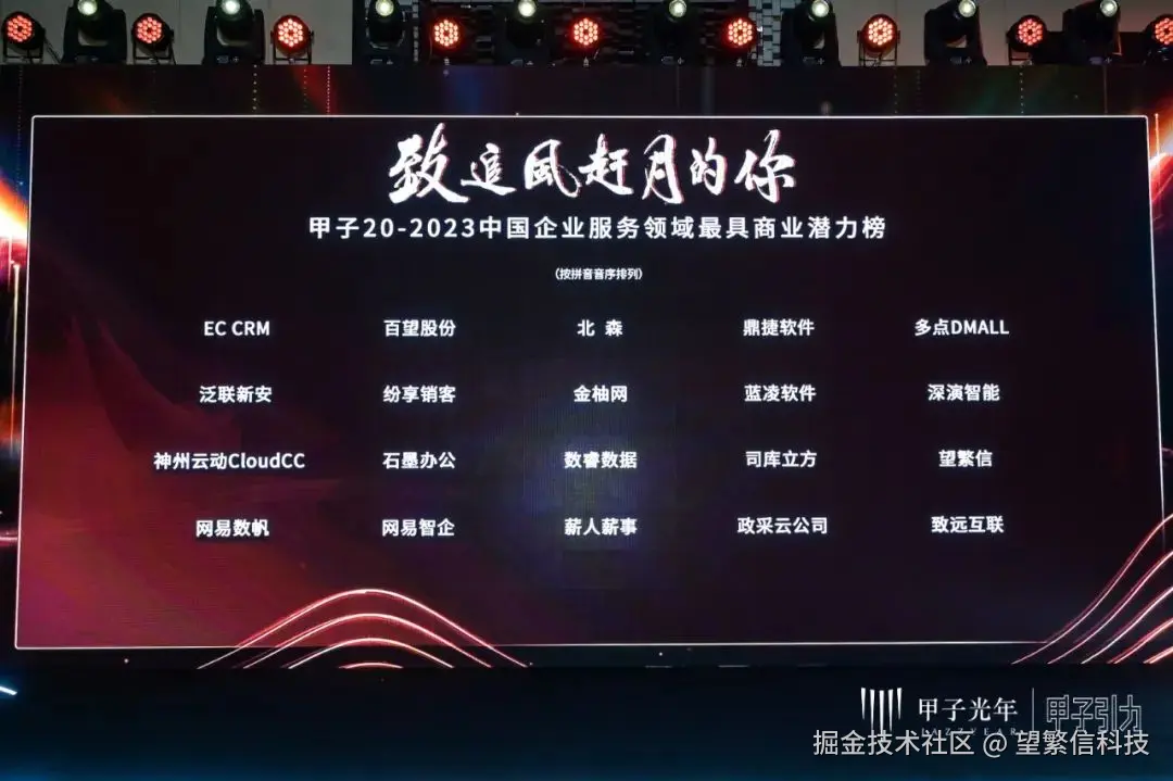 2023年11月30日-12月1日,「2023甲子引力年终盛典·致追风赶月的你」在北京成功举办。作为中国领先的流程挖掘服务商,望繁信科技凭借突出的技术研发实力及产品落地能力,成功入选“甲子20—2023中国企业服务领域最具商业潜力榜”。