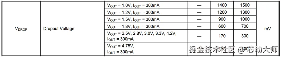 指保持电压稳定所需要的输入电压和输出电压之间的最小差值。当输入电压为VIN1,输出为VOUT1,缓慢降低VIN1,当输出降低到VOUT1的98%时,此时输入电压为VIN2,那么Vdrop=VIN2-VOUT1*98%,Vdrop越小越好,意味着低功耗高效率。