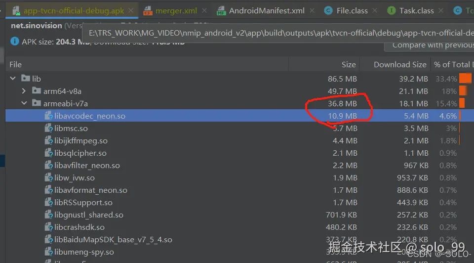 有时候我们需要优化apk的包体积大小。比如下面这样的。一个so文件大小有10M。但是我们并不知道so文件是那个库引入的。所以需要研究一下。