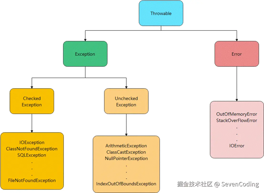 Throwable 包含两个子类:Error(错误)和 Exception(异常),它们通常用于指示发生了异常情况。
