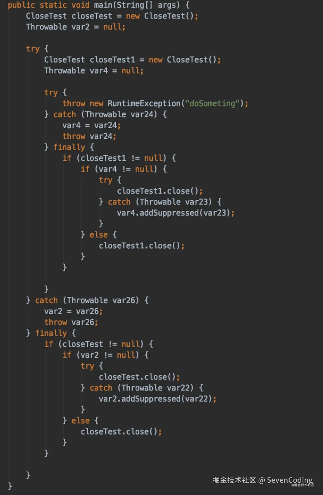 try-with-resources语句其实是一种语法糖,通过编译之后又回到了开始说的嵌套的那种模式: