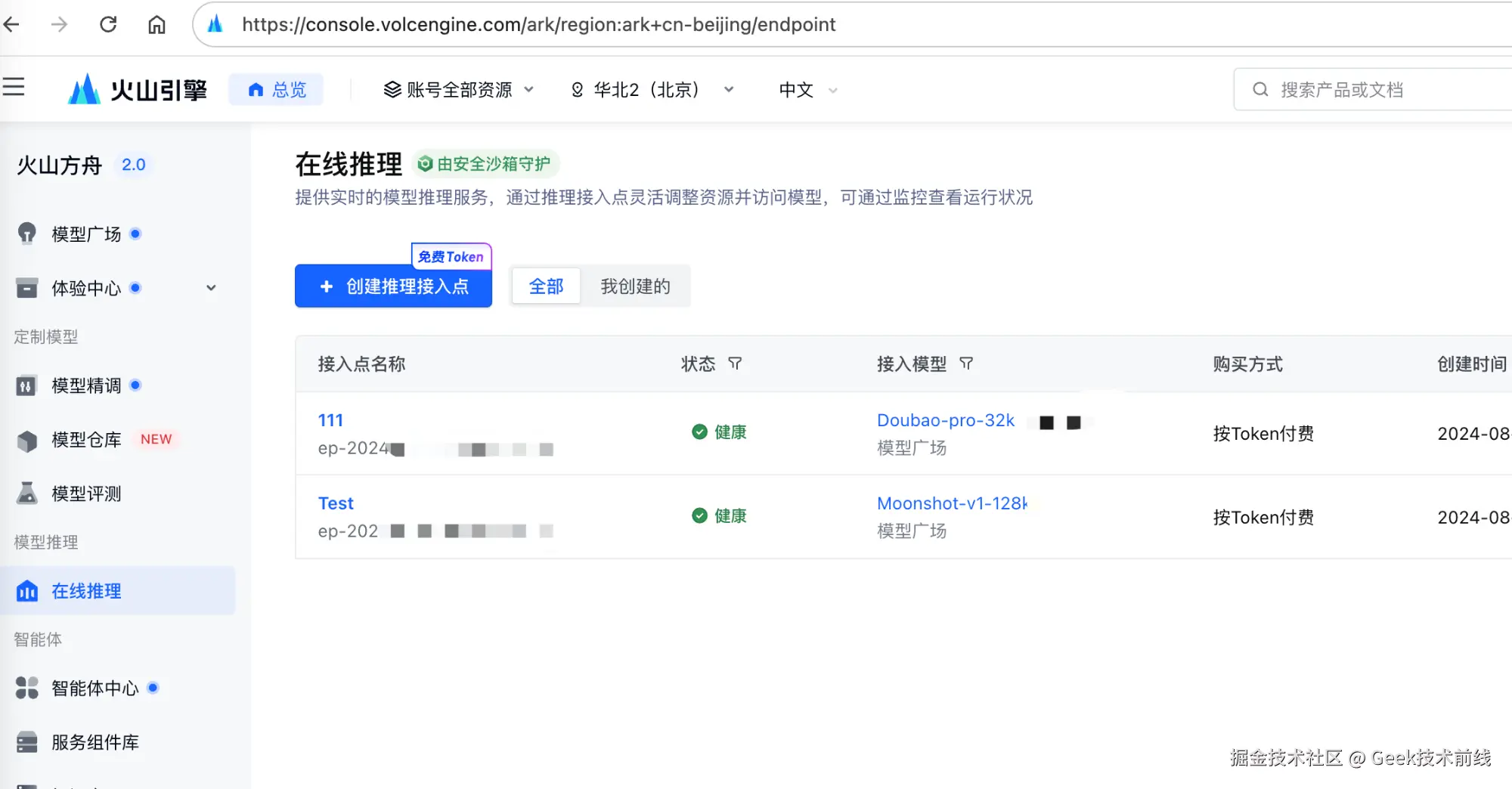 完成相关基础的注册认证后,前往火山方舟在线推理新建接入点