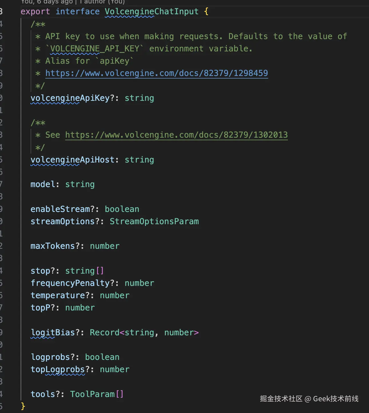 我们对外导出ChatVolcengine类作为模型对接使用。按照火山引擎的文档将相关的模型参数作为构造类的入参