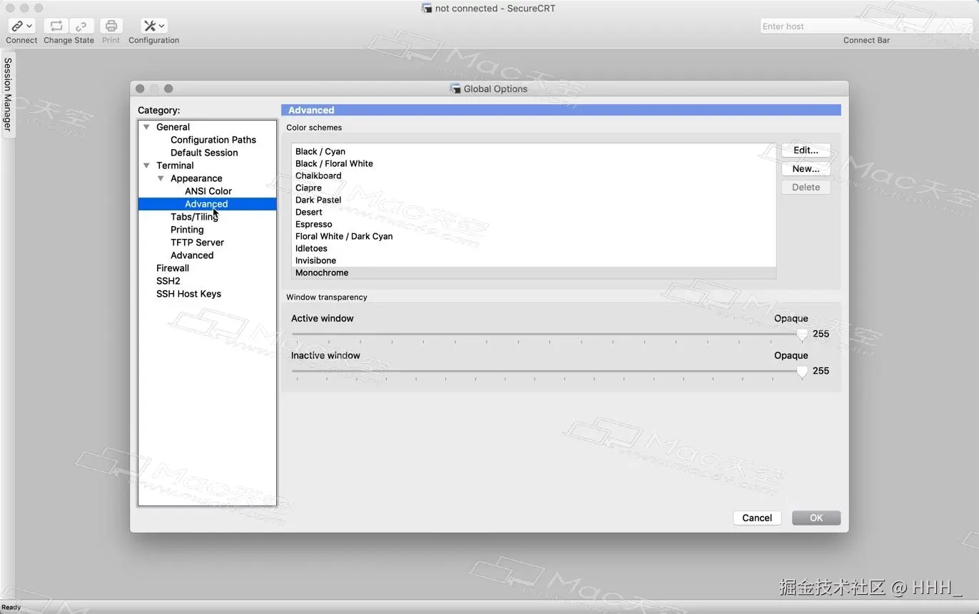 | 配色方案 预定义的配色方案(包括Solarized)可以轻松改变终端工作区的外观。从各种具有协调背景,前景和ANSI颜色的浅色和深***彩组合中进行选择。 | |