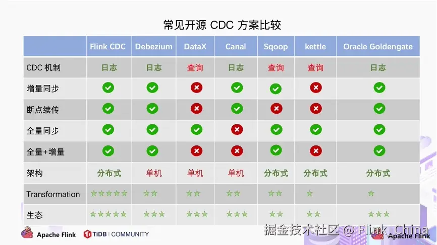 如上图所示,从 CDC 机制、增量同步、断点续传、全量同步、全量+增量、架构、数据计算、生态这八个方面做了对比,可以看出其中的佼佼者主要是 Flink CDC 和 Oracle OGG 以及 Debezium。