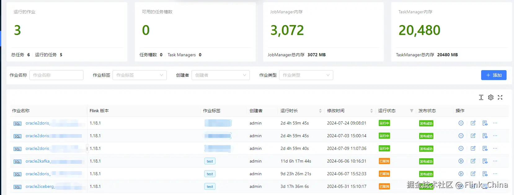 - 通过平台编写 Flink SQL 任务,将 Oracle 的数据直接存入到 Doris 中,下图为线上作业效果图。