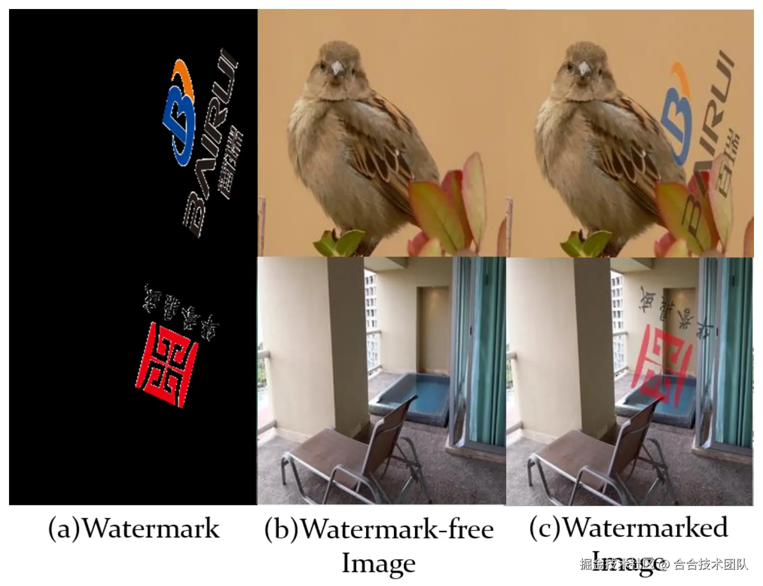 水印去除的目标是基于带水印的图像重建背景图像,这是一个开放且具有挑战性的问题。水印能够以不同的大小、形状、颜色和透明度叠加在背景图像的任何位置。此外,水印通常包含复杂的图案,如扭曲的符号、细线、阴影效果等,导致水印去除任务变得极其困难。下图展示了一个水印、无水印图像和带水印图像的示例。