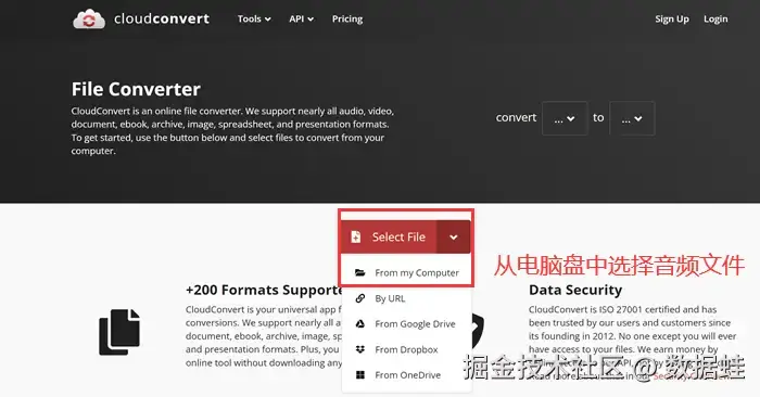 步骤一: 进入 CloudConvert网站,点击红色的 【Select File】 ,点 【From my Computer】 ,从你的电脑中选择目标文件。