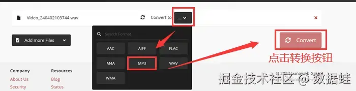 步骤二: 在本页面选择音频转换格式为 【MP3】 (注:因为我们选择的文件是音频,所以默认转换格式也为音频格式)。完成格式设置后,点击红色按钮 【Convert】 完成转换。