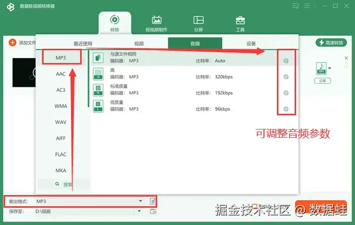 数据 蛙视频转换器是一款功能强大的软件,特别擅长音频和视频格式的转换。怎么转mp3格式?对于mp3格式转换,它提供了简单直观的操作界面,用户只需轻松导入音频文件,即可快速将其转换为mp3格式。软件支持多种其他音频格式的转换,并保持高质量的输出效果,确保转换后的文件音质和画质不受损。此外,软件还具备丰富的编辑功能,方便用户在转换过程中进行必要的调整和优化。无论是个人用户还是专业人士,该视频转换器都能满足您对音频格式转换的需求。