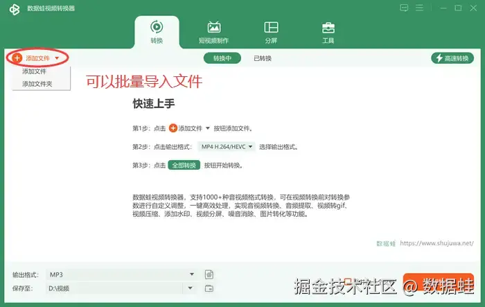 步骤一: 在成功启动数据蛙视频转换器之后,您只需轻点界面中的 【添加文件】 按钮,随后进入文件浏览界面,从中选取您想要进行格式转换的目标视频文件。