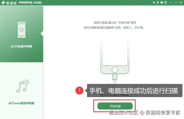 步骤1:在官方网站中下载并安装恢复软件后,将手机和电脑通过数据线连接到一起,打开软件点击 【开始扫描】 进行操作。